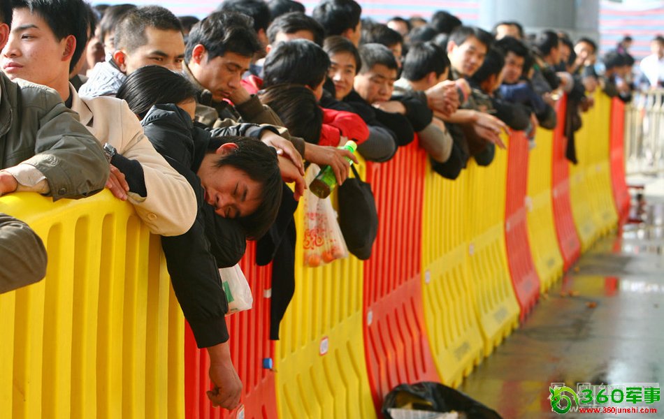 2010年1月20日,宁波国际会展中心铁路临时售票点,长长的队伍中,广西小伙梁献贵趴在隔离栏上酣然入眠,这是他三年来第一次回家。