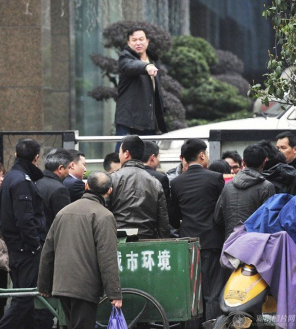 据悉,死者王可军的尸体上的两个弹孔,一个在心脏旁,一个在腹部。“子弹打得很准,非一般人所为。”王的家人推测。图为2月19日中午,长沙市八一路富丽华酒店门口,死者王某家属在酒店前讨要说法,随后被保安驱赶离开。