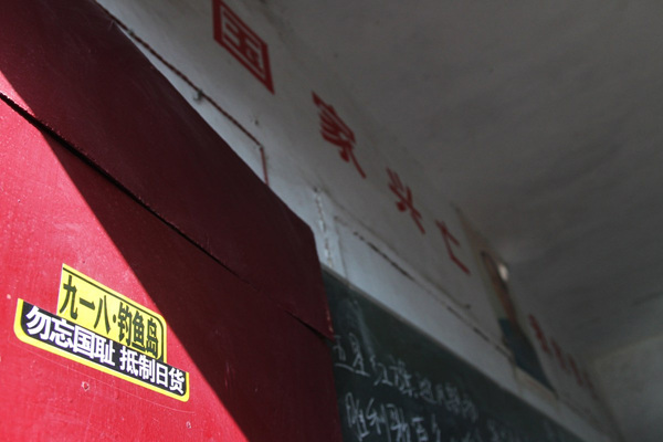 教室门上贴着“九一八 钓鱼岛;勿忘国耻,抵制日货”。