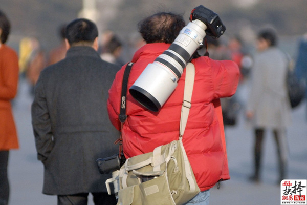 3月2日,政协预备会议,摄影记者站在梯子上拍摄。