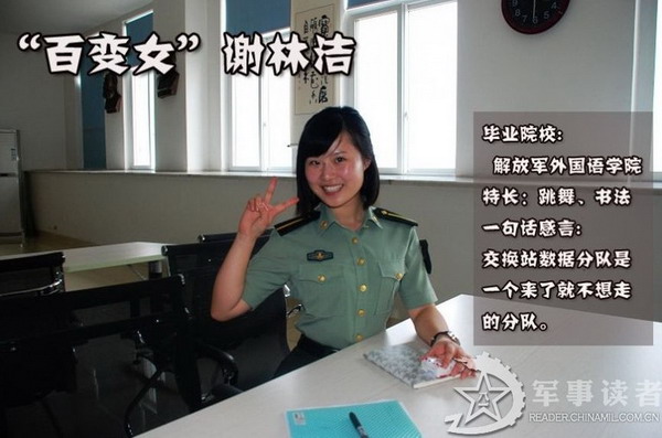 “百变女”谢林洁。谢林洁心得体会:在通信团为期一个月的当兵锻炼时间转眼即逝, 但有句话说的好,经历使人成长,在这个单位里我学到了很多东西,感受也非常深刻。7月12日这一天,我们二十多个战友被分配到各个基层单位实习锻炼,目的 是让我们对即将踏入的军营有更加充分和深入的认识,扎根基层走好军旅生涯的第一步。幸运的我和另外三个校友被一同分到了第三通信团。在这里我了解了很多在 学校没有接触过的东西,不仅熟悉了营里官兵的日常生活和基层单位的日常工作,而且对一个兵,一个真正的军人有了更深刻的认识。在学校里,我认为只要做好队 列动作,搞好体能,把自己的专业学好就可以做一名合格的军人。但现在看来,我错了,那时的想法太单纯了。要做一名合格的兵不容易,做一名优秀的军官更难。 军人就是要以服从命令为天职,以履行神圣使命为己任。