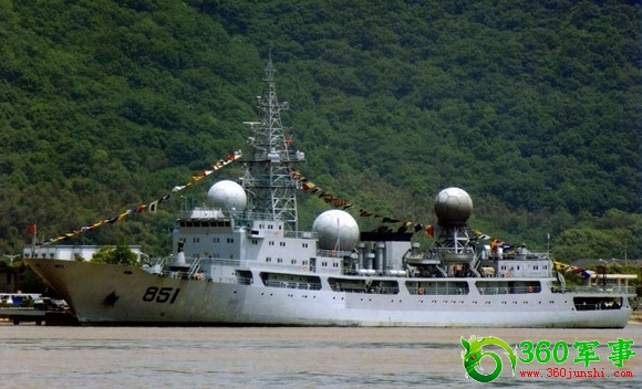 从船的布置和装备来判断851号情报收集舰(原“东调”232号)除用于传统的情报搜集外,还可进行导弹跟踪,即具有航天测量船的某些功能。船上大型桅杆可安装众多雷达天线和侦察设备,3部跟踪用抛物面天线直径都较小,只能以战术导弹跟踪为主要任务。